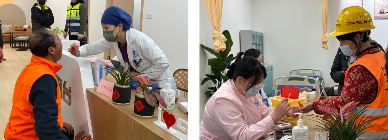 对于平日从事体力劳动的工友而言,定期体检很有必要。志愿者们带来了血压血糖监测、口腔健康检查等服务,赢得一众好评。