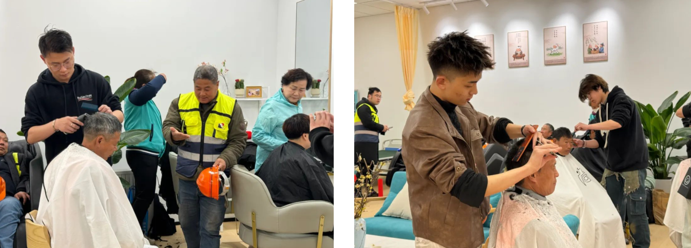 理发服务颇受欢迎。经验丰富的“托尼老师”耐心询问每位工友对于发型的要求,依次为大家打造清爽的发型。“年后复工忙,每天都在工地上,也没时间去理发,今天学雷锋活动解决了我的‘头等大事’,太好了。”看到镜子里自己的发型焕然一新,工友们的脸上洋溢着笑容,个个精气神十足。