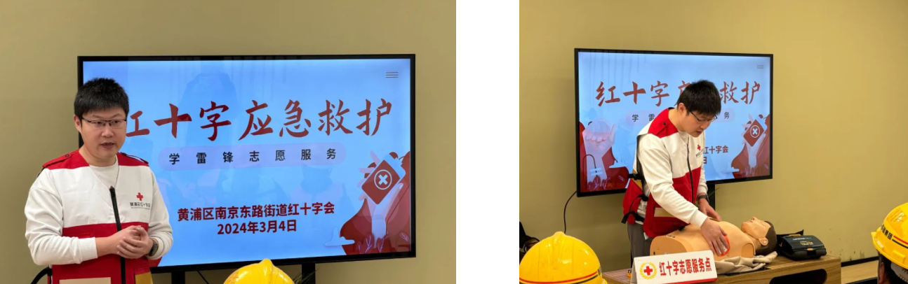 安全是建筑工地的“生命线”。来自黄浦区南京东路街道红十字会的志愿讲师现场授课,用通俗易懂的语言为工友们讲解了AED除颤器的使用、心肺复苏、创伤救护等急救知识,并示范了心肺复苏等实用救护技能,进一步提高了一线作业人员应对突发事件的应急救护和自救互救能力,营造了“人人懂急救、人人重安全”的浓厚氛围。